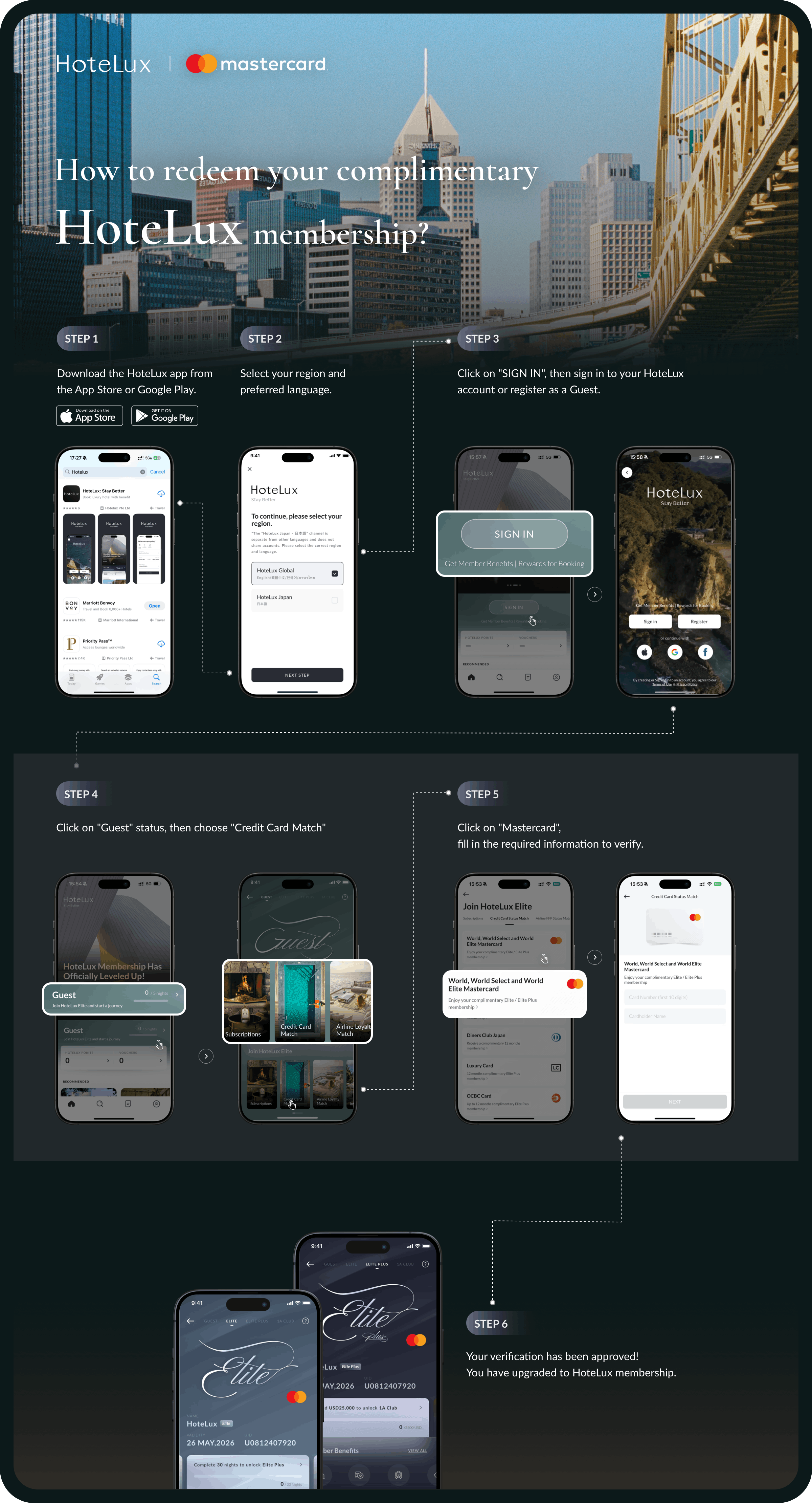 Navodila za koriščenje ugodnosti v aplikaciji HoteLux: 1. Prenesite aplikacijo HoteLux iz trgovine App Store ali Google Play. 2. Izberite svojo regijo in jezik. 3. Kliknite »SIGN IN«, nato izberite »Credit Card Match«. 5. Kliknite na »Mastercard« in izpolnite zahtevane podatke za preverjanje. 6. Če je preverjanje kartice uspešno, bo vaša nadgradnja aktivirana.